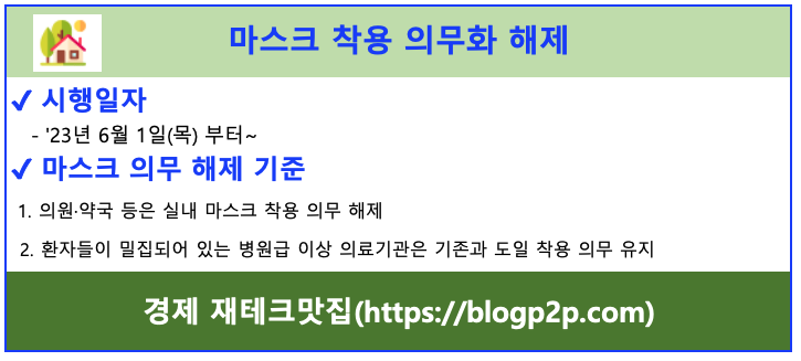 - 의원·약국 등에서 유지되던 실내 마스크 착용 의무화는 23년 6월 1일부 전면 해제