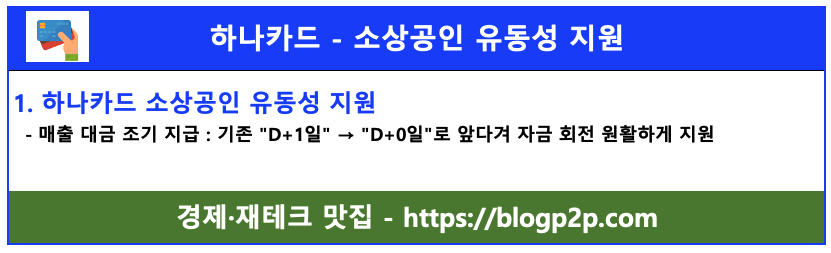 소상공인의 유동성 확보 및 지원을 위해서 매출에 대한 조기 지급 프로그램을 진행해서 기존 매입일 기준 "D+1일"에서 "D+0일"로 하루 앞당겨 즉시 지급하는 것으로 하나카드 영세 가맹점을 대상으로 지원