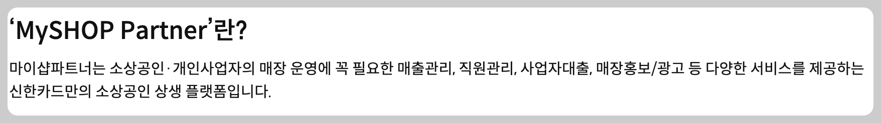 신한 마이샵 파트너는 소상공인 ·자영업자·개인사업자의 매장 운영에 필요한 매출관리, 직원관리, 사업자대출, 매장홍보, 매장광고 등 다양한 서비스를 제공하는 신한카드사의 소상공인 상생 플랫폼 서비스입니다.