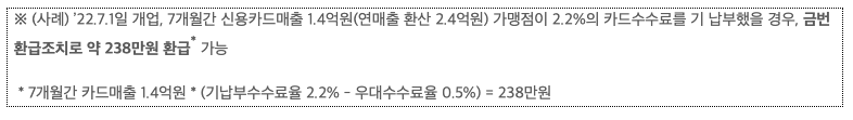 2022년 하반기인 '22.7.1~'22.12.31 동안 신규 카드가맹점으로 개업하여 일반수수료율을 적용받고 있다가 이번에 국세청 과세자료 등을 통해서 매출액 규모가 영세·중소 가맹점으로 선정이 된 사업장은 환급 대상이 되는데 요약하면 아래와 같습니다