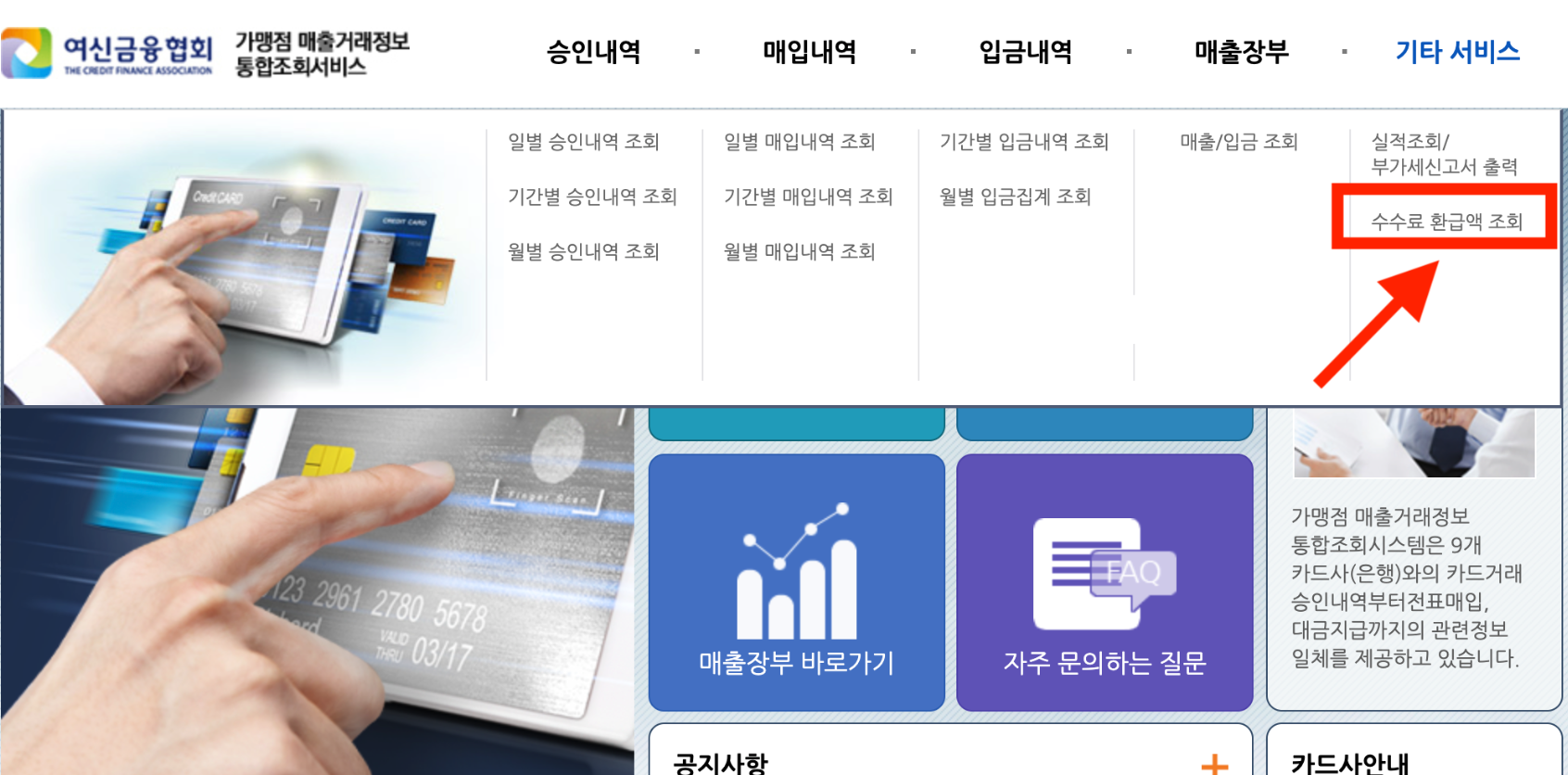여신금융협회 접속 → 기타 서비스  → 수수료 환급액 조회 순으로 진행하면 됩니다.