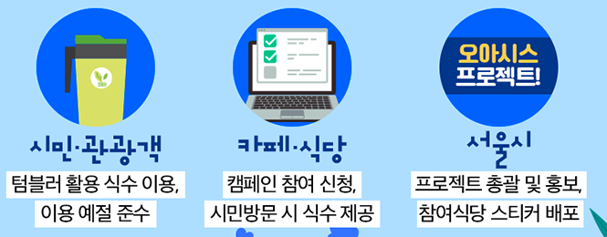 서울시는 초기에 카페와 식당, 음식점 등을 대상으로 텀블러만 가져오면 식수(시원한 물)를 공짜로 주는 오아시스 프로젝트를 추진하였으나, 지난 6월 참여 매장 모집 과정에서 스포츠센터, 공인중개사 사무소, 학원, 인테리어 업체 등 67개소가 자발적으로 신청하면서 서울시내 1천개를 넘어서면서 시민도 그리고 사업장에도 상호 도움이 되고 있습니다