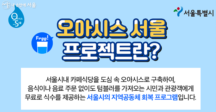음식이나 음료를 유료로 주문하지 않더라도 텀블러를 가져오는 시민과 관광객들에게 무료로 식수를 제공해주는 서울시의 지역공동체 회복 프로그램입니다.