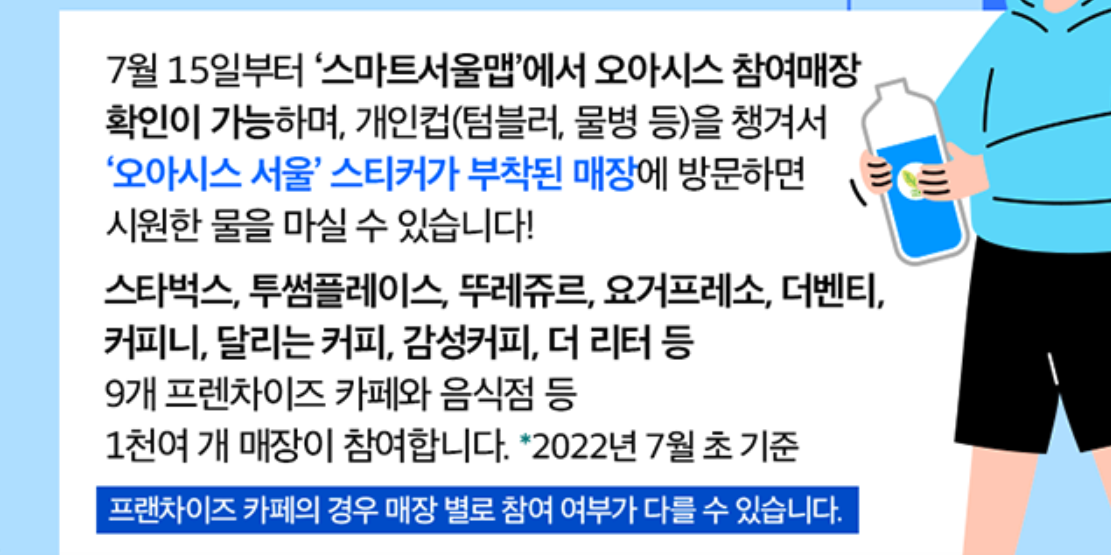 서울시민과 서울을 방문한 사람들은 오아시스 스티커가 부착된 매장에 텀블러를 지참하고 방문해 식수를 담으면 됩니다