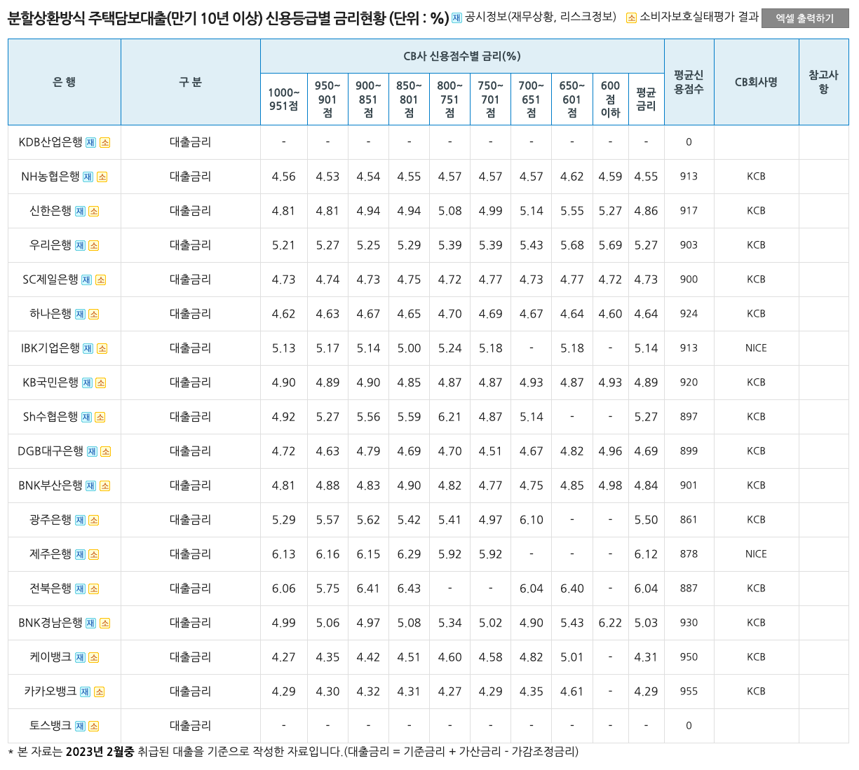 개인 신용평가가 951~1000점 사이의 기준으로, 제일 낮은 금리는 카카오뱅크의 4.29%이고, 제일 높은 주택담보대출 금리는 제주은행의 6.13%입니다.