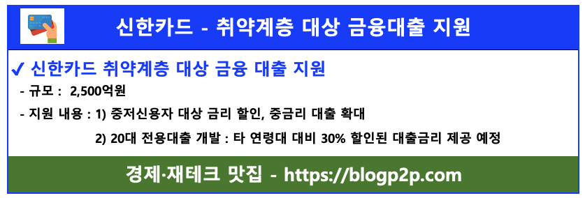 신한카드 상생금융 2500억원은 금융 취약게층 대상으로 금율대출을 시행하는데, 중저신용자 대상으로 금리를 할인해서 중금리 대출을 확대하고 20대 전용 대출 상품 개발을 통해서 타 연령대 대비 30% 할인된 대출금리를 제공할 예정