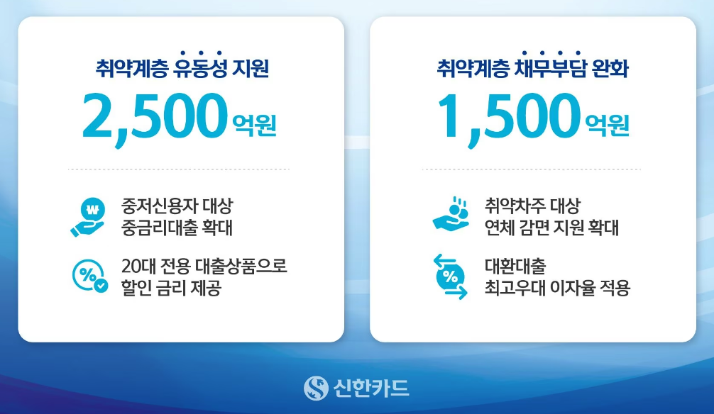 신한카드를 이용하고 있는 차주 대상으로 연체 감면 지원을 확대 시행하고 대환대출 최고우대 이자율을 적용하는 등 취약 차주의 채무부담 완화를 위해 약 1500억원을 지원할 예정