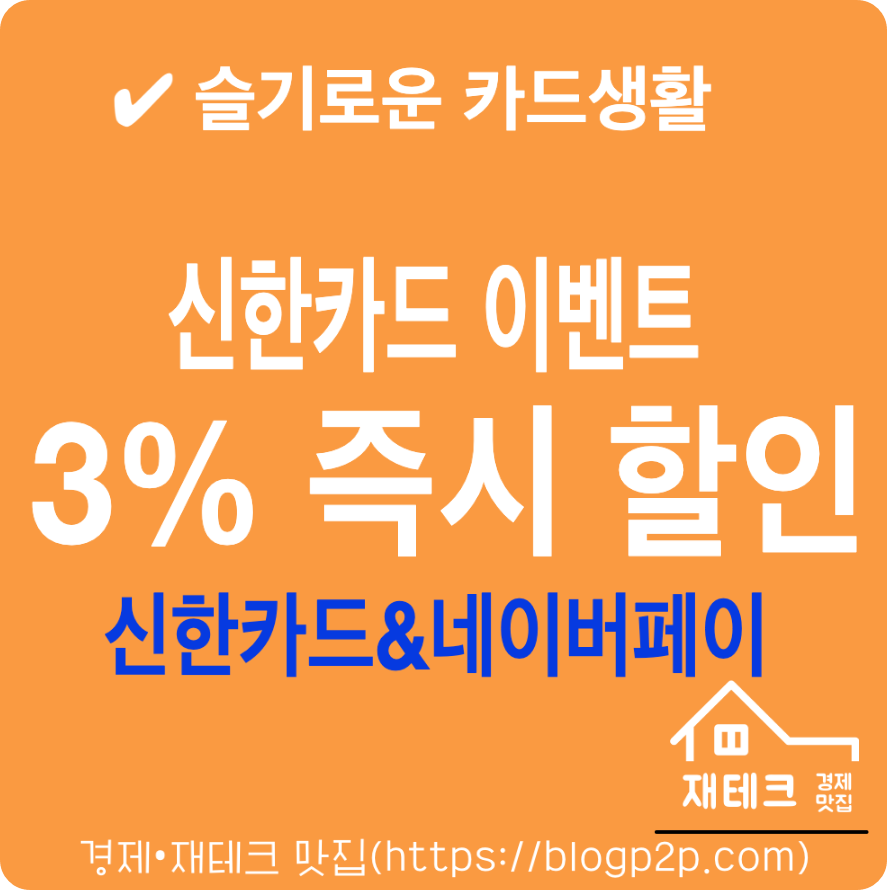그 중 신한카드로 20만원 이상 네이버페이 간편 결제시 3% 즉시 할인 이벤트 중이라 내용을 정리해봤습니다.
