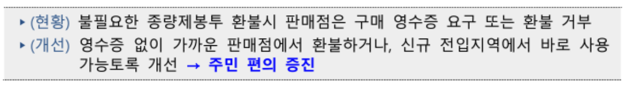 - 개선 : 영수증 없이도 가까운 편의점에서 환불이 가능해지며, 신규 전입(이사)한 지역에서 이전에 사용했던 종량제 봉투를 그대로 사용이 가능해짐
