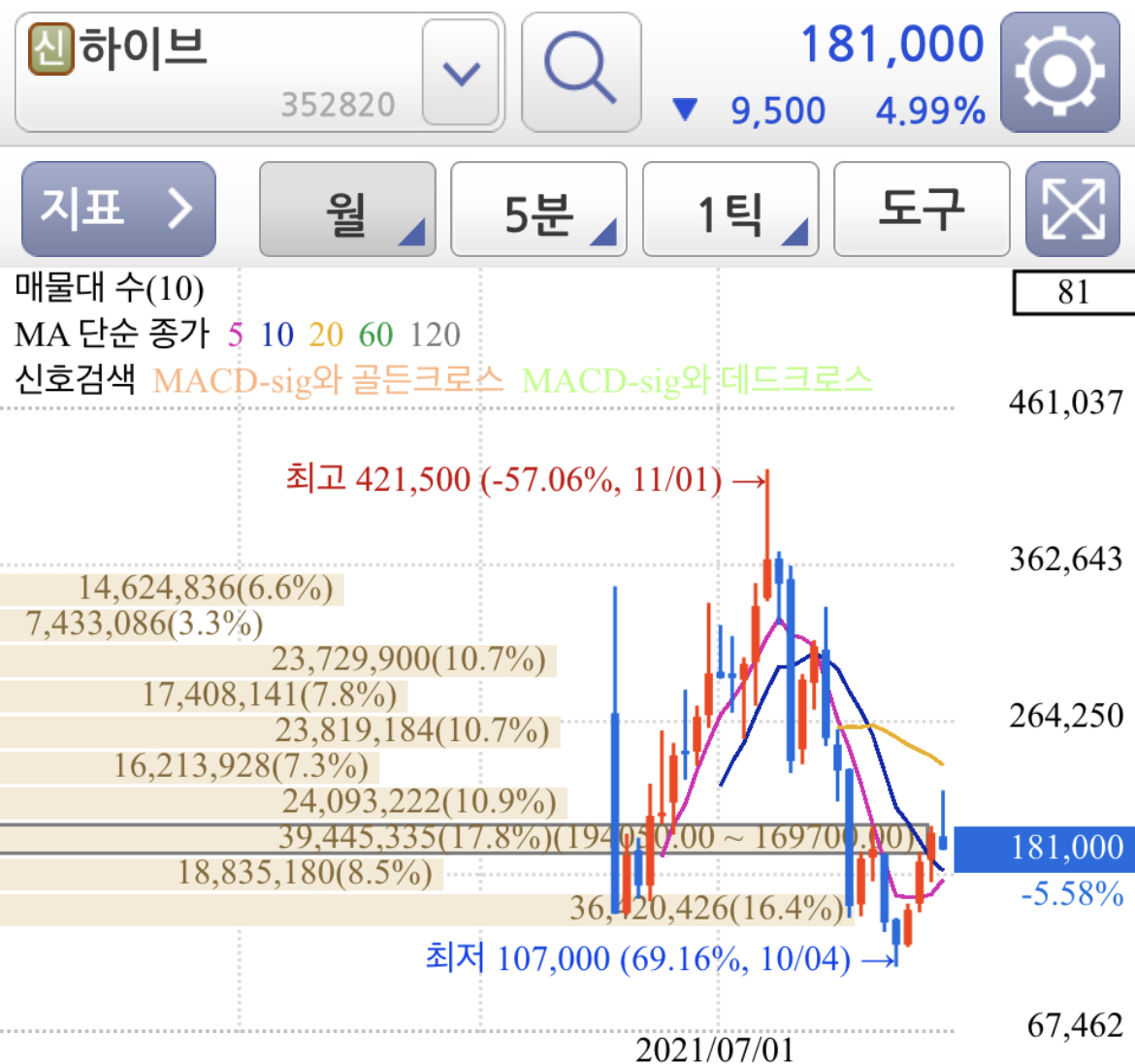 단기 고점 우려해서 이익 실현해야겠지만, 카카오와 하이브 중 최소 13만원 수준에서 다시 공개 매수 가격이 뜰 수 있기 때문에 굳이 매도할 필요성은 단기간으로는 없어 보입니다.