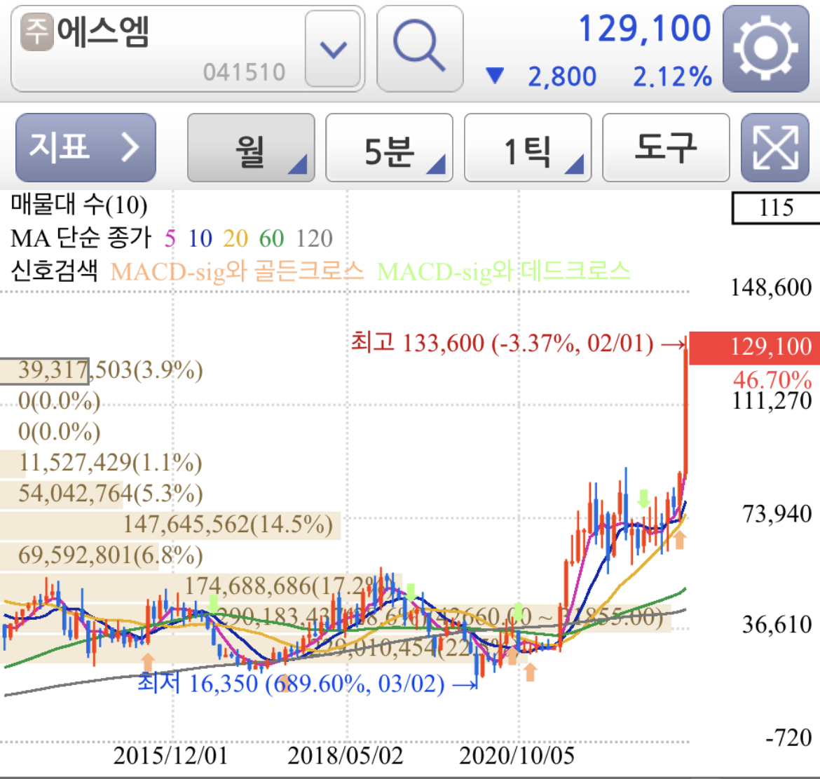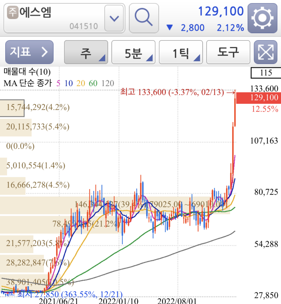 에스엠의 주가는 아래 일봉 차트와 같이 사상 최고가를 경신하면서 최고 133,600원까지 상승했습니다.