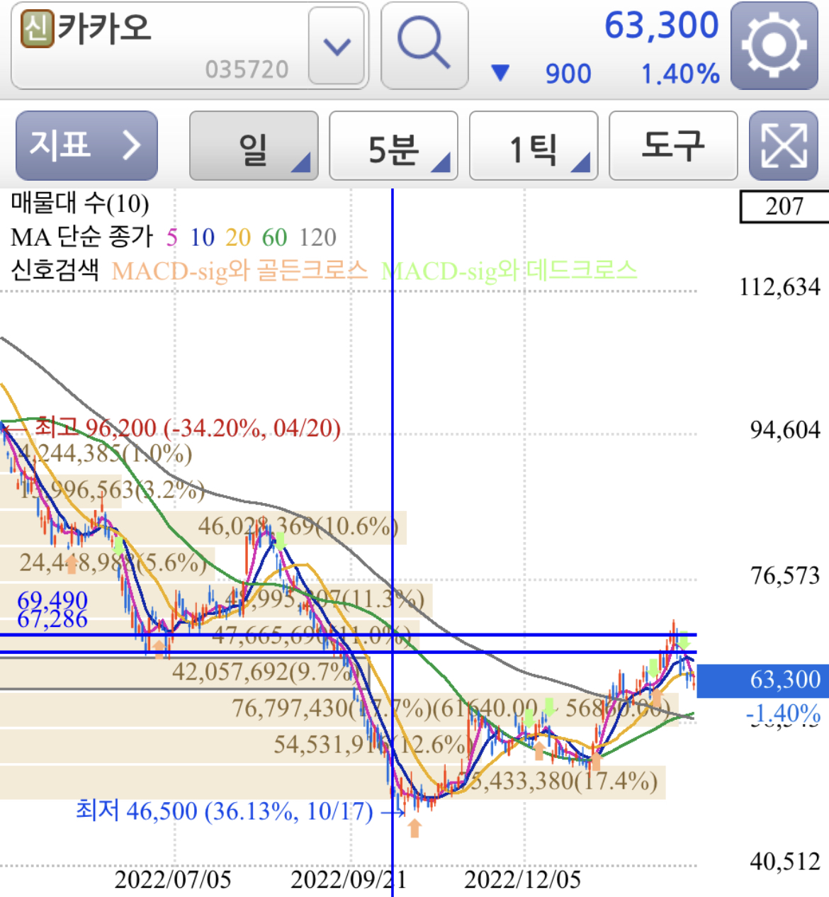 카카오 일봉 차트를 보면 긴 하락 추세에서 바닥을 찍고 상승 추세 전환을 위해 꿈틀거리는 모습입니다.