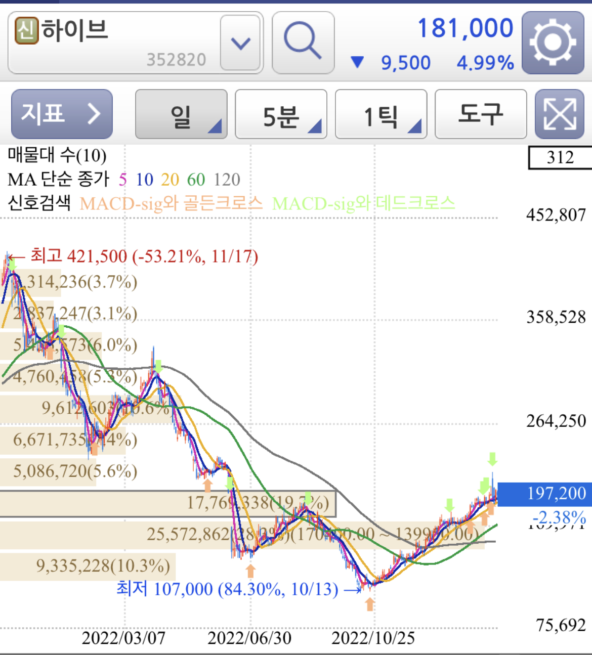 단기 고점 우려해서 이익 실현해야겠지만, 카카오와 하이브 중 최소 13만원 수준에서 다시 공개 매수 가격이 뜰 수 있기 때문에 굳이 매도할 필요성은 단기간으로는 없어 보입니다.
