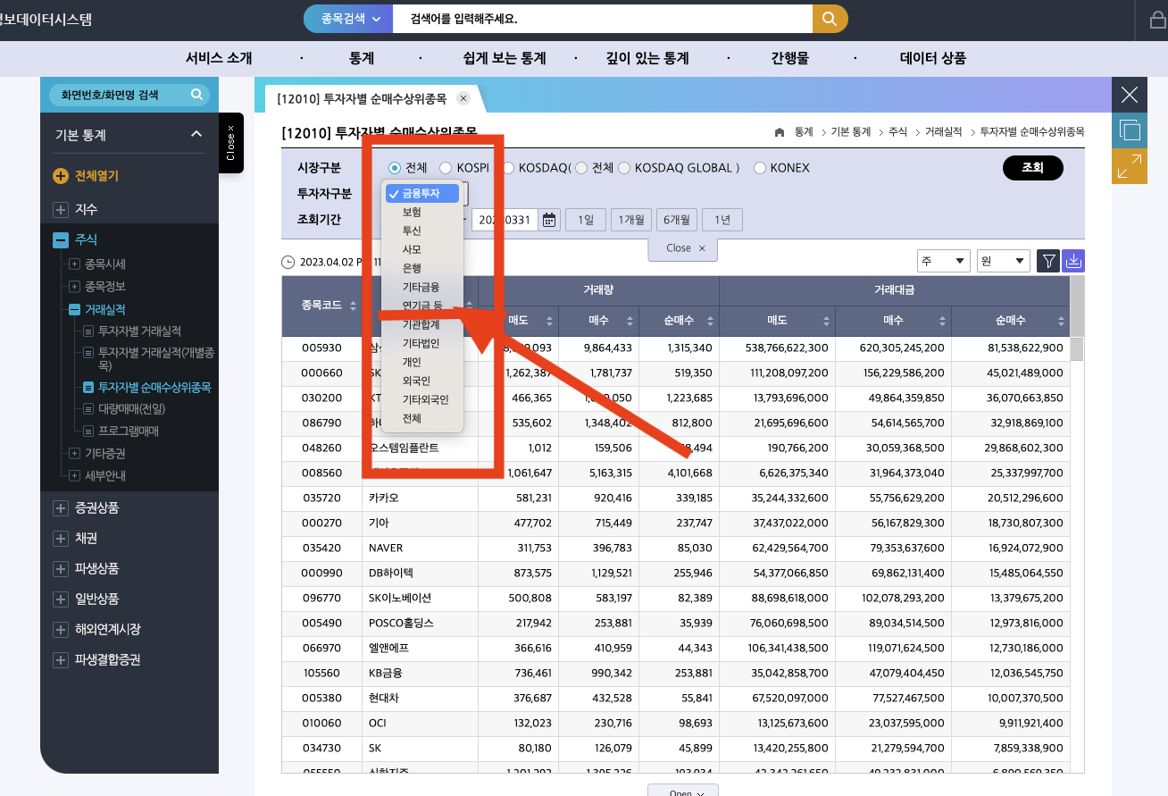 아래 화면과 같이 주식 > 거래실적 > 투자자별 순매수 상위종목 메뉴를 클릭하면 우측에 화면이 변경됩니다.
