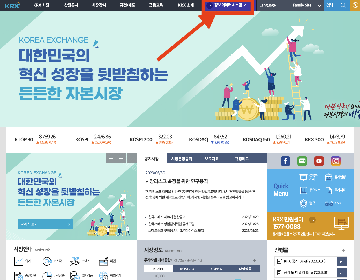 먼저, 국내 주식 시장의 전반적인 자료가 있는 한국거래소 홈페이지에 접속합니다.