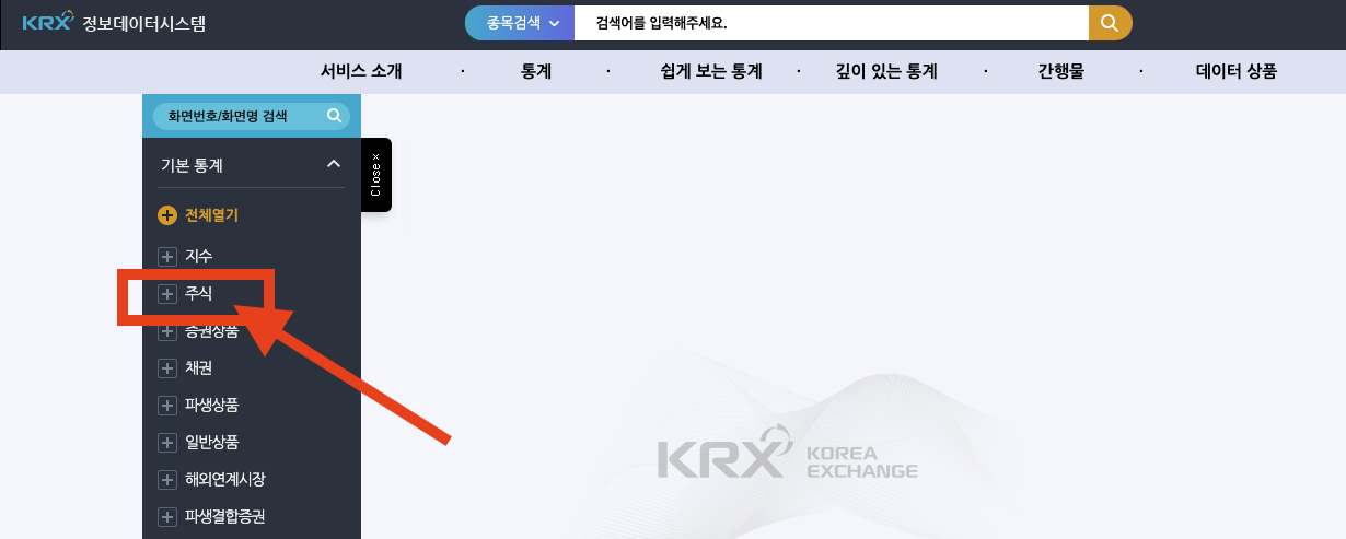 통계 메뉴를 클릭하면 좌측에 메뉴가 아래와 같이 변경이 되는데, 좌측 메뉴 중에서 '주식' 메뉴를 클릭해줍니다.