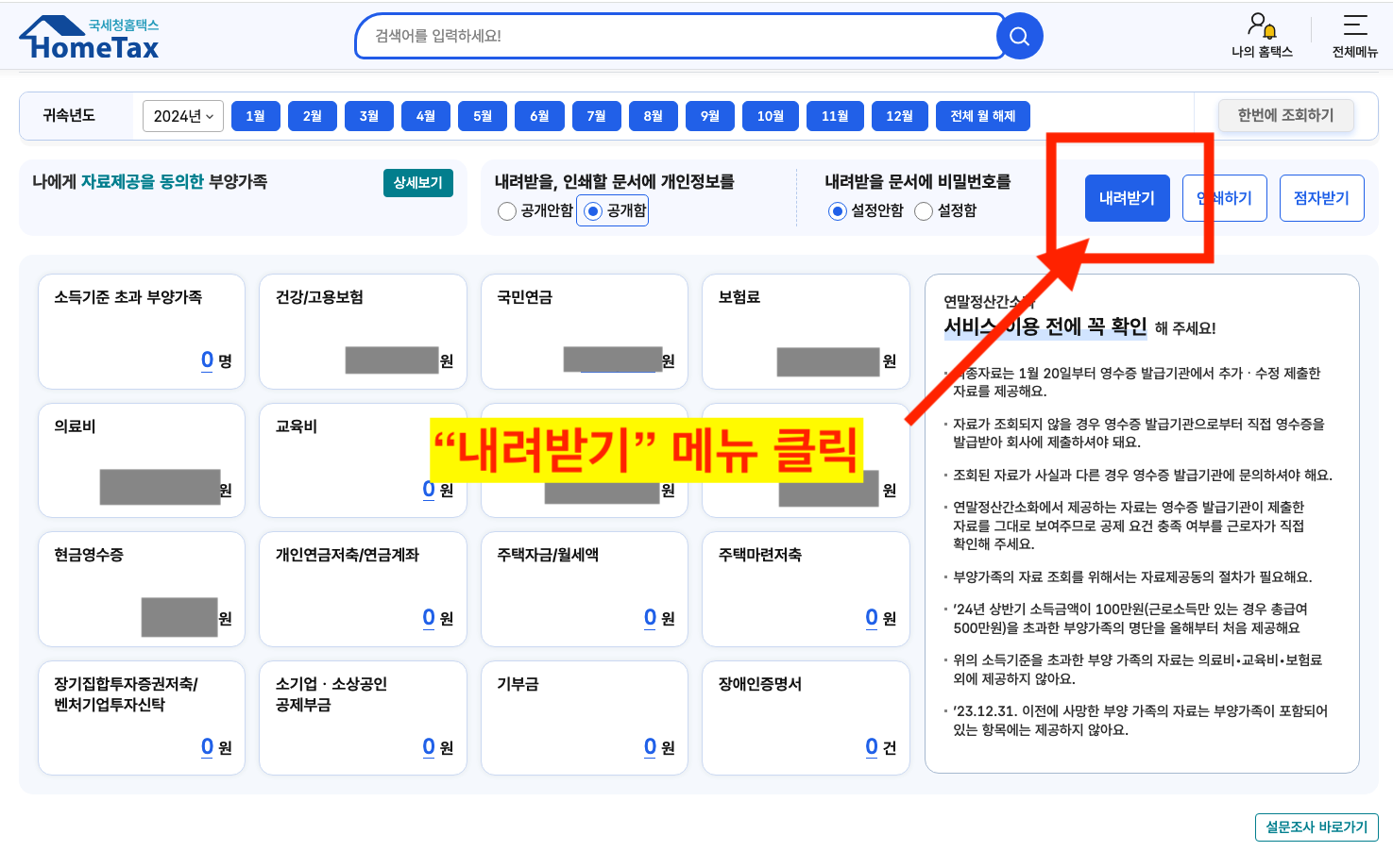 귀속년도 2024년 기준으로 1월, 2월, 3월, 4월, 5월, 6월, 7월, 8월, 9월, 10월, 11월, 12월 모두 한번ㄴ에 모든 소득공제, 세액공제 내역을 한번에 조회가 가능하다.