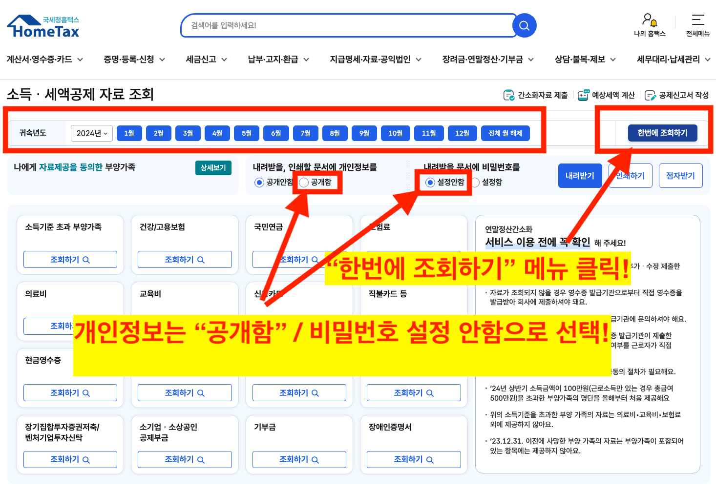 귀속년도 2024년 기준으로 1월, 2월, 3월, 4월, 5월, 6월, 7월, 8월, 9월, 10월, 11월, 12월 모두 한번ㄴ에 모든 소득공제, 세액공제 내역을 한번에 조회가 가능하다.