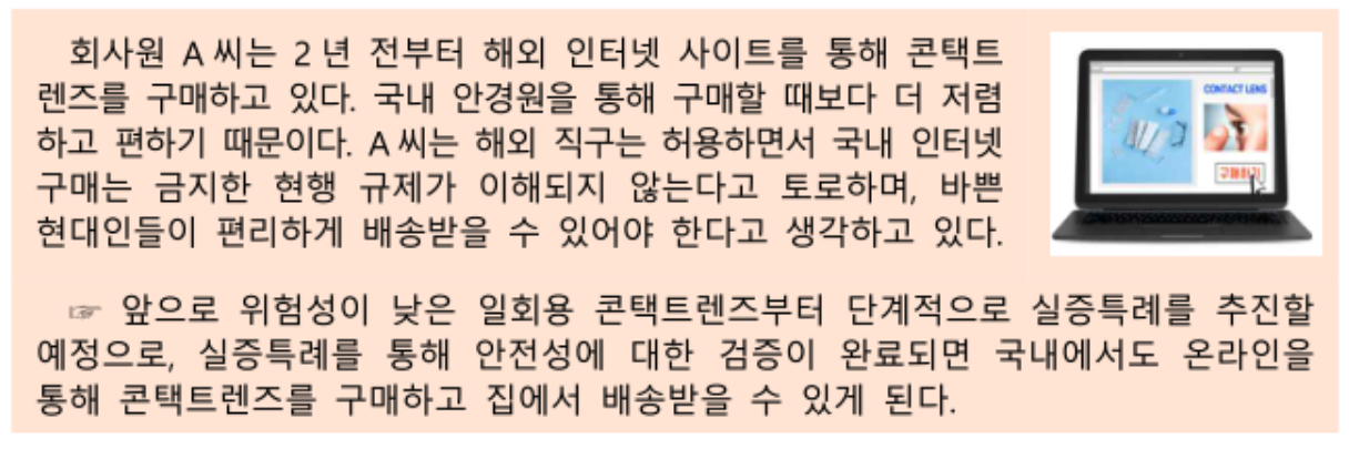 콘택트렌즈의 경우, 국내에선 온라인 판매가 금지되어 있지만 해외 직구 사이트를 통해서 저렴하게 구매하는 사람들이 증가하면서 국내의 안경점을 방문해서 구매해야만 가능한 법을 개선하는 내용인데 아래 예시를 살펴보겠습니다.