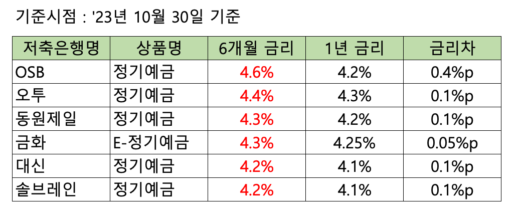 - OSB 저축은행 : 6개월 금리 4.6% vs 1년 금리 4.2%