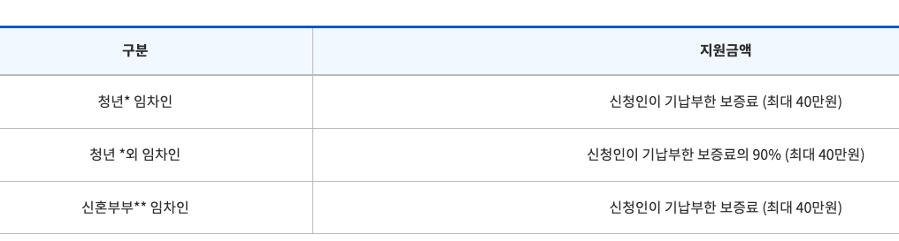 단, 청년외의 경우 신청인이 기납부한 보증료의 90%를 최대 40만원 한도 내 지원