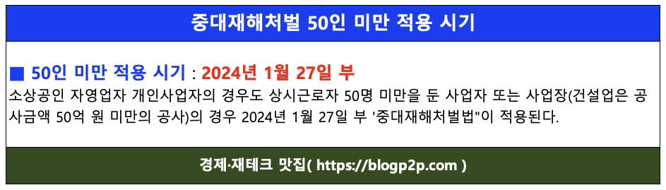 중대산업재해를 예방하고 근로자의 생명과 신체를 보호하기 위해서 2022년 1월 27일부 시행이 되었는데 50인 미만의 경우에는 3년 유예가 되어서 2024년 1월 27일 부 유예가 끝나기 때문에 시행이 된다.