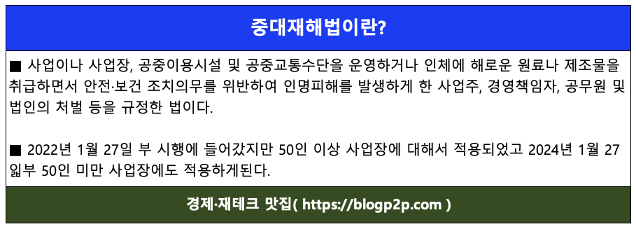 중대산업재해를 예방하고 근로자의 생명과 신체를 보호하기 위해서 2022년 1월 27일부 시행이 되었는데 50인 미만의 경우에는 3년 유예가 되어서 2024년 1월 27일 부 유예가 끝나기 때문에 시행이 된다.