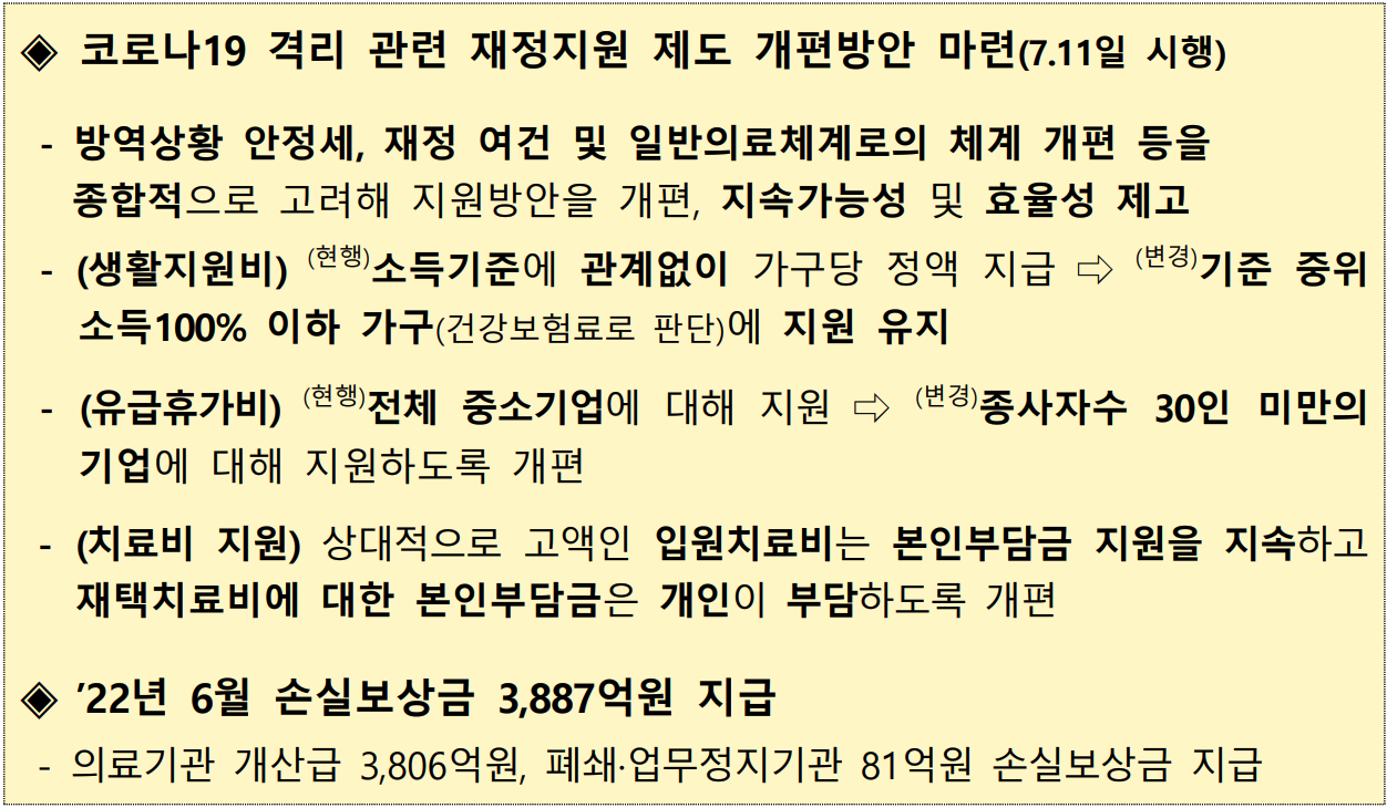 ◈ 코로나19 격리 관련 재정지원 제도 개편방안 마련(7.11일 시행)