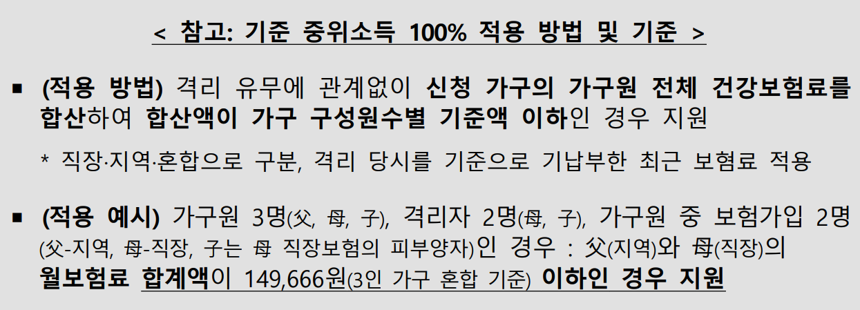 - 해당 가구가 기준중위소득 100% 이하인지를 판단하는 기준은 국민의 신청 편의와 신속한 지원을 위해 건강보험료 기준을활용한다.