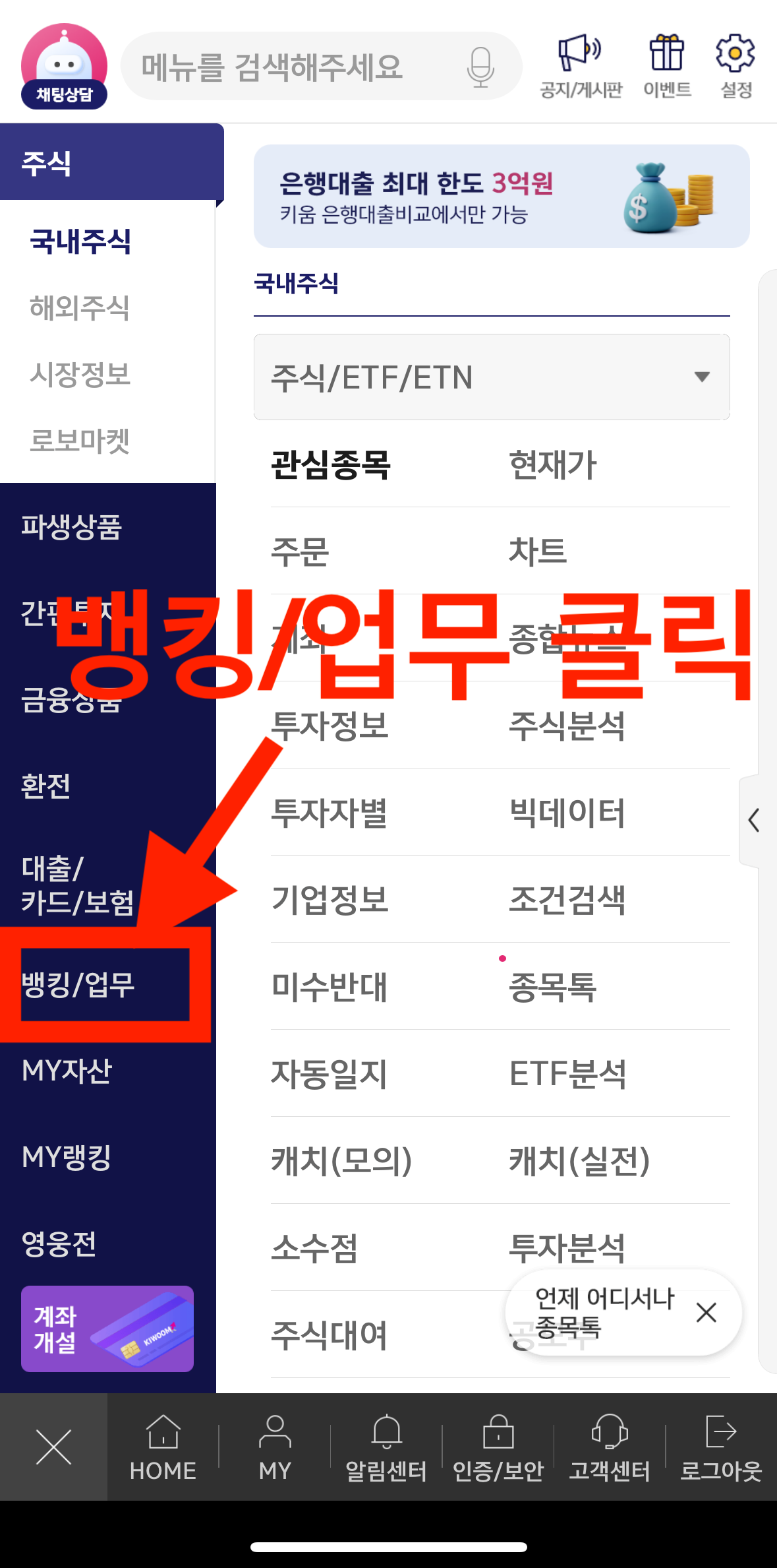 - 좌측 슬라이딩 메뉴 중 "뱅킹/업무" 선택