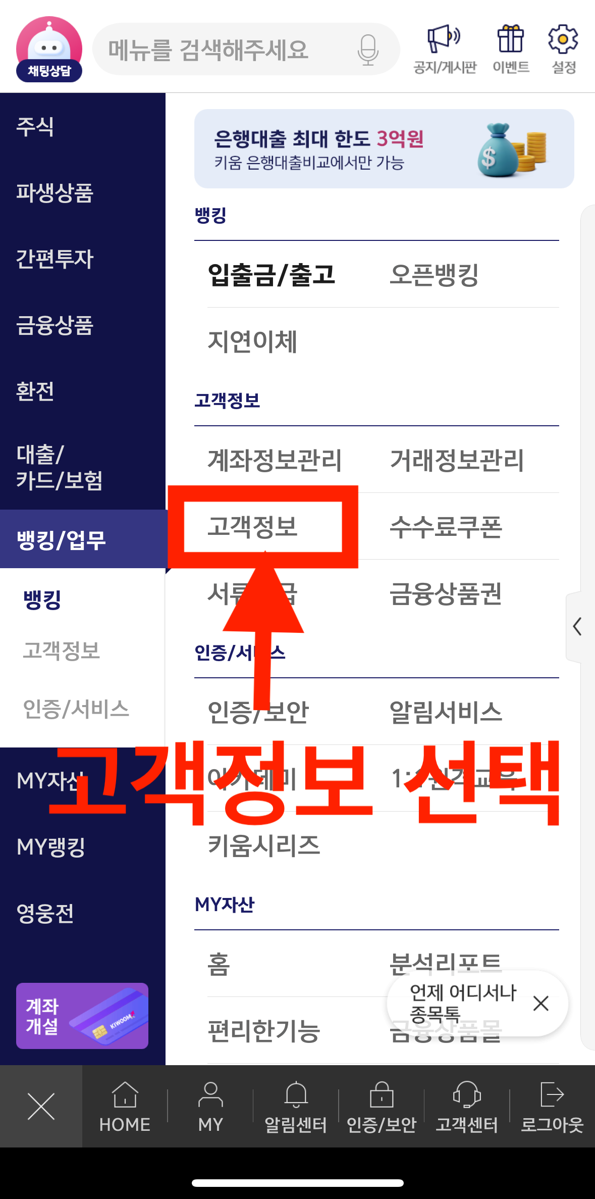 4. 좌측 슬라이딩 메뉴 중 "고객정보' 선택