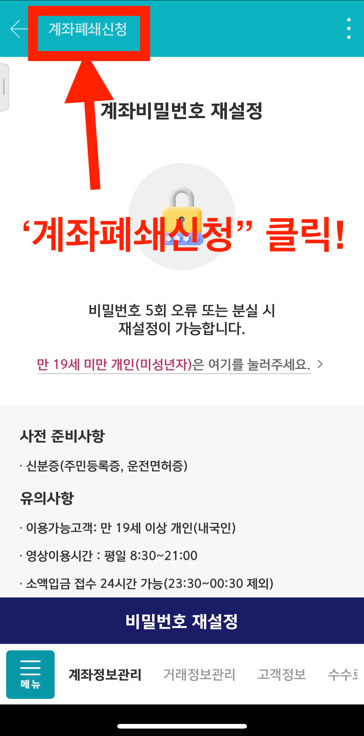 • 메뉴 > 뱅킹/업무 > 고객정보 > 계좌정보관리 > 계좌폐쇄신청