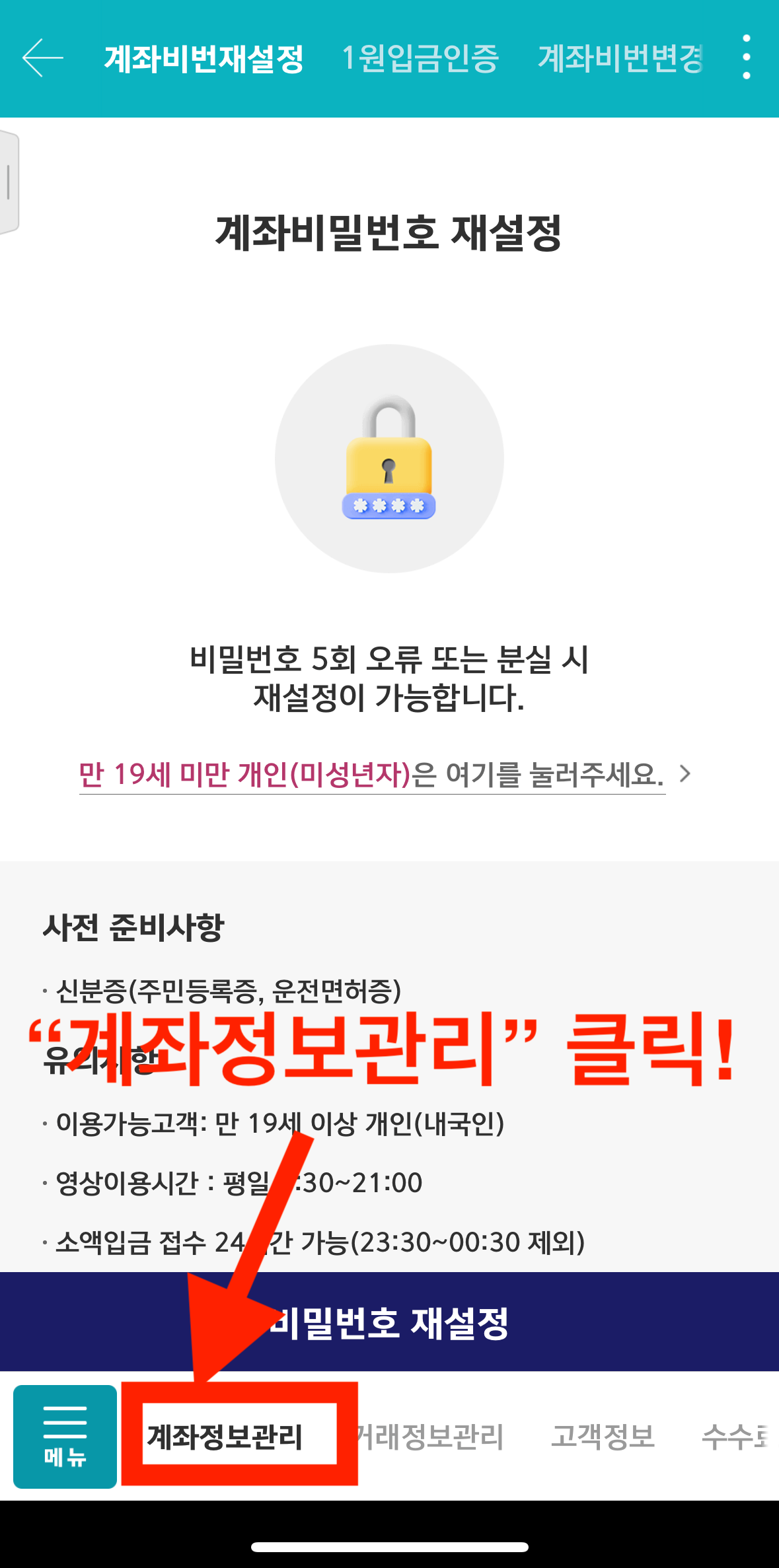 5. 하단 메뉴 중 "계좌정보관리" 선택