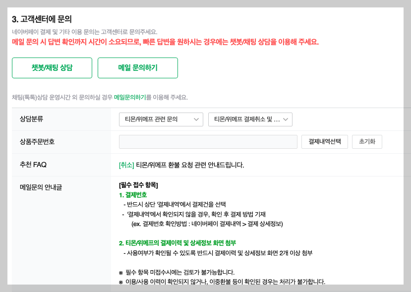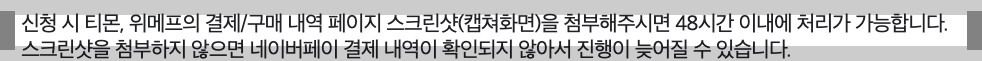 - 티메프(티몬+위메프) 결제/구매 내역 페이지 : 결제 구매 내역을 스크린샷으로 첨부하지 않으면 네이버페이 결제 내역을 확인하는 시간이 소요되어 카드취소 환불 절차가 늦어질 수 있습니다