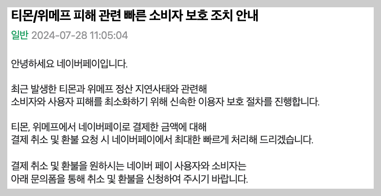 24년 7월 28일(일) 11시에 네이버페이 공지사항에 아래와 같이 '티몬/위메프 피해 관련 빠른 소비자 보호 조치 안내" 타이틀로 공지사항이 올라왔습니다.