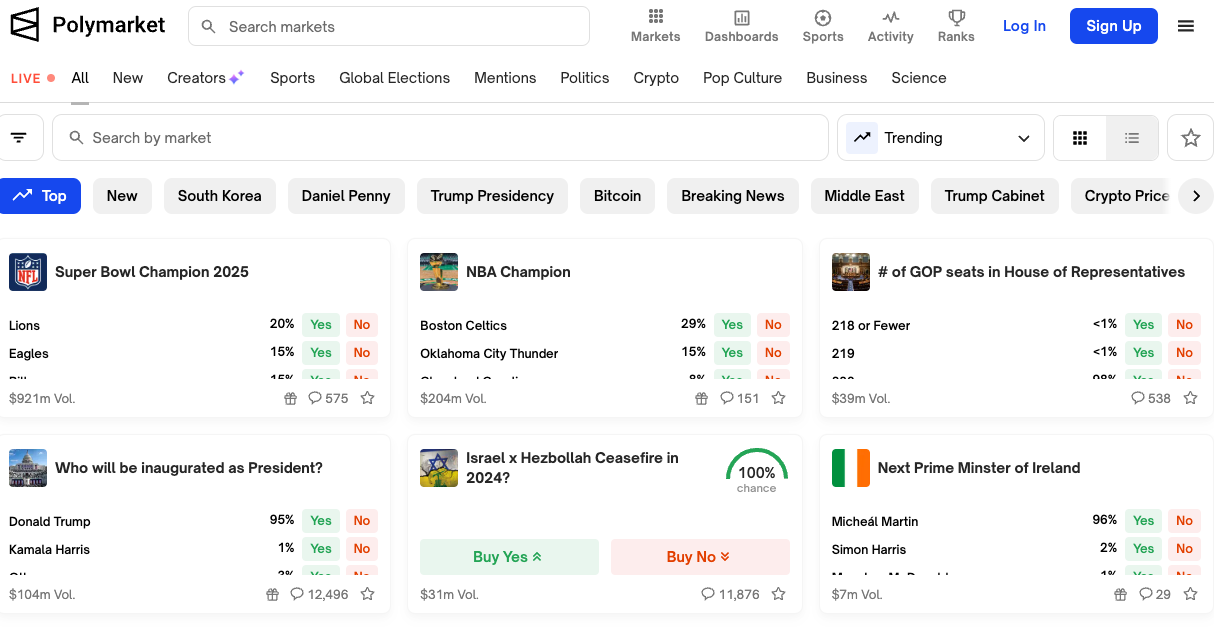스포츠, 암호화폐, 정치 등 다양한 분야에서 결과를 에측하고 배팅할 수 있는 사이트로 이번 미국 대선에서도 트럼프의 승리를 예측하는 등 핫한 이슈에 대해 에측하고 시장의 반응을 볼 수 있다.