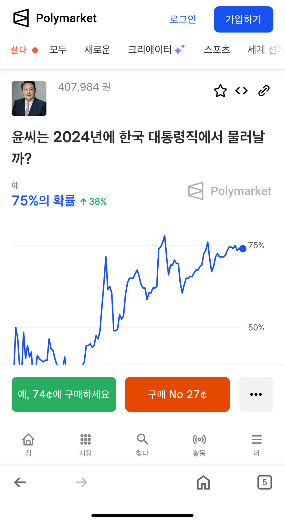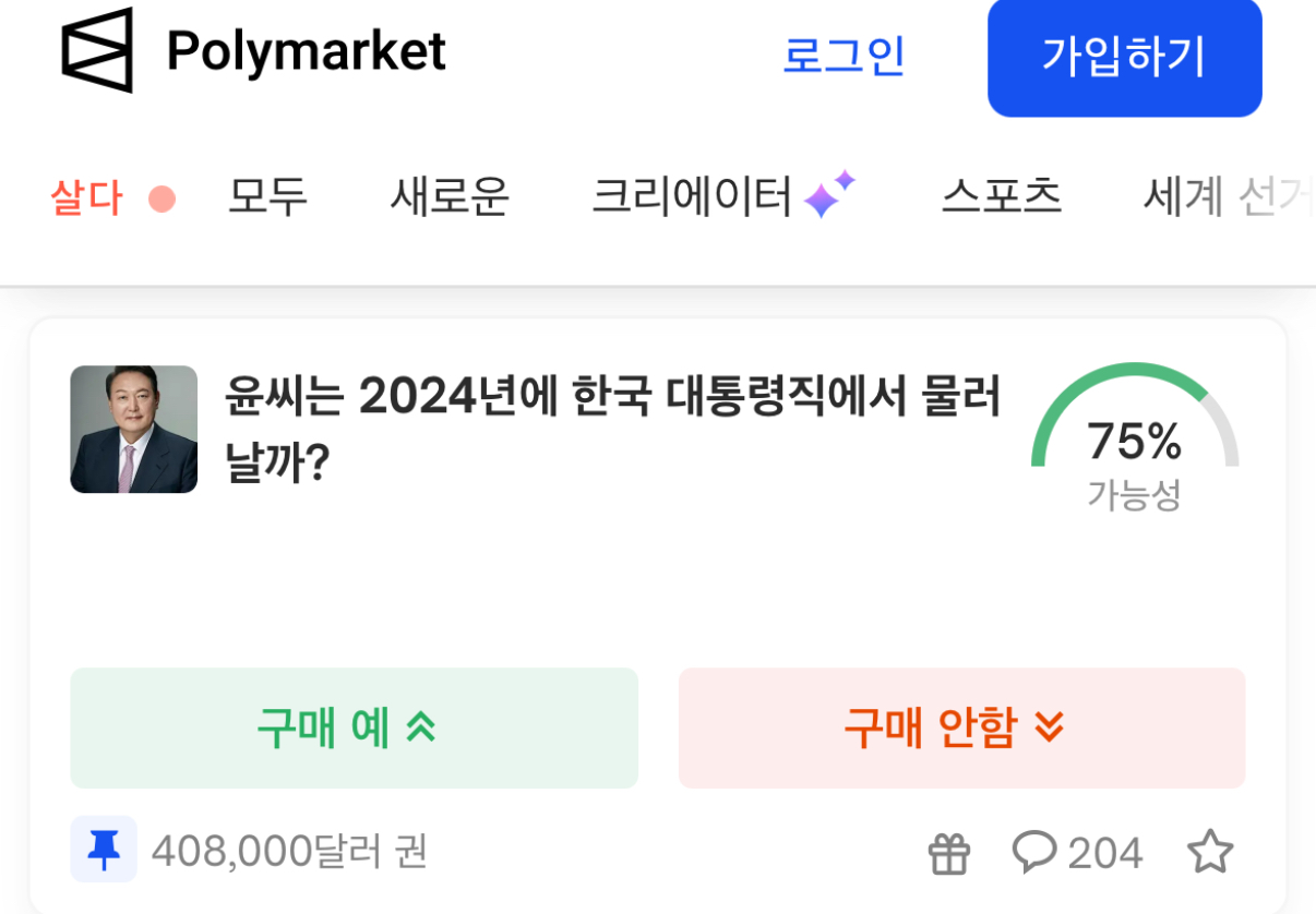 한국 윤석열대통령 탄핵 미국 배팅사이트 폴리마켓 75% 등장