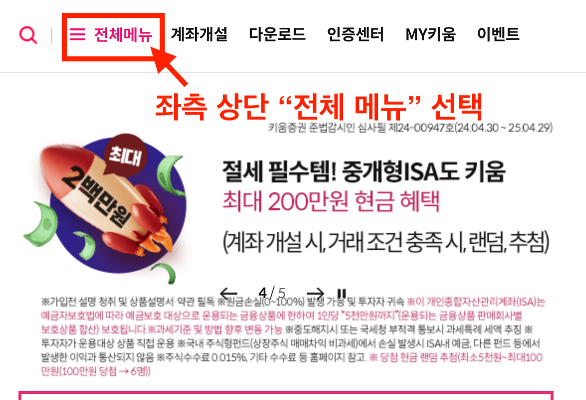 아래와 같이 키움증권 홈페이지 접속 후 상단 좌측에 있는 "전체 메뉴"를 선택합니다.
