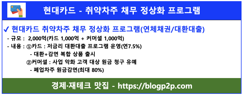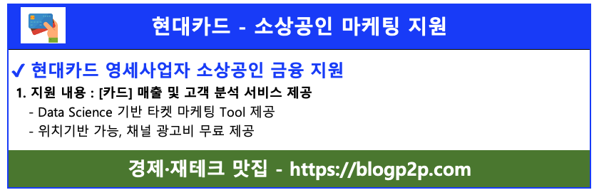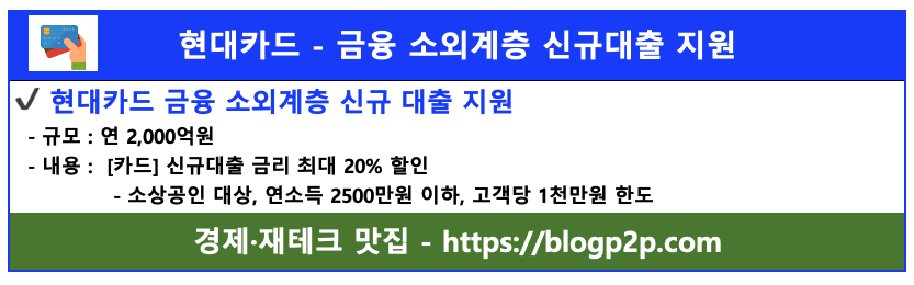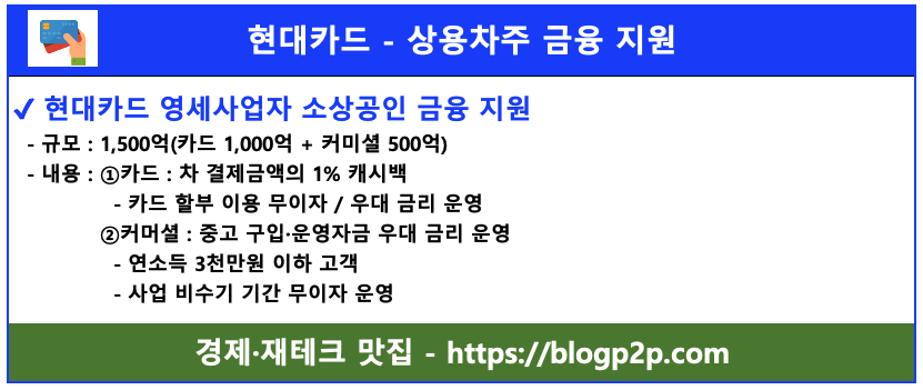 현대카드에서 어려움에 처해했는 소상공인·자영업자와 취약계층에 대해서 신규대출금리 할인, 영세 사업자 우대금이, 상용차 금융지원, 저금리 대환대출 프로그램, 원금 청구 유예, 매출 분석 마케팅 툴 서비스 제공 등 다양한 상생 금융 지원을 하기로 발표했습니다.