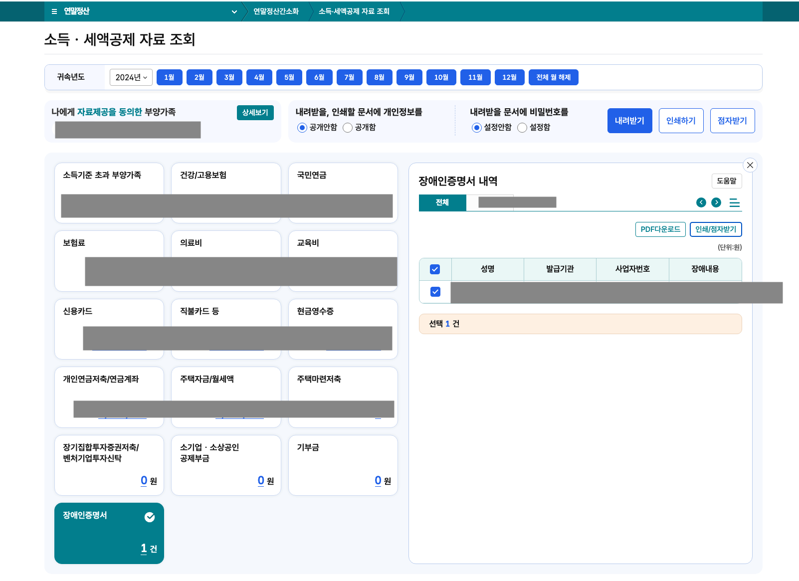 2024년 귀속 연간 소득공제, 세액공제 자료를 출력물과 PDF파일로 저장해서 제출