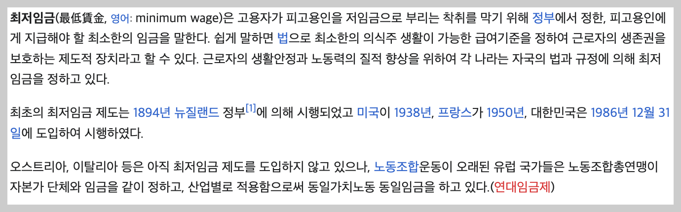- 최저 월급 : 2,060,740원[일 8시간, 주 40시간 근무 209시간(주휴시간 35시간 포함)]
