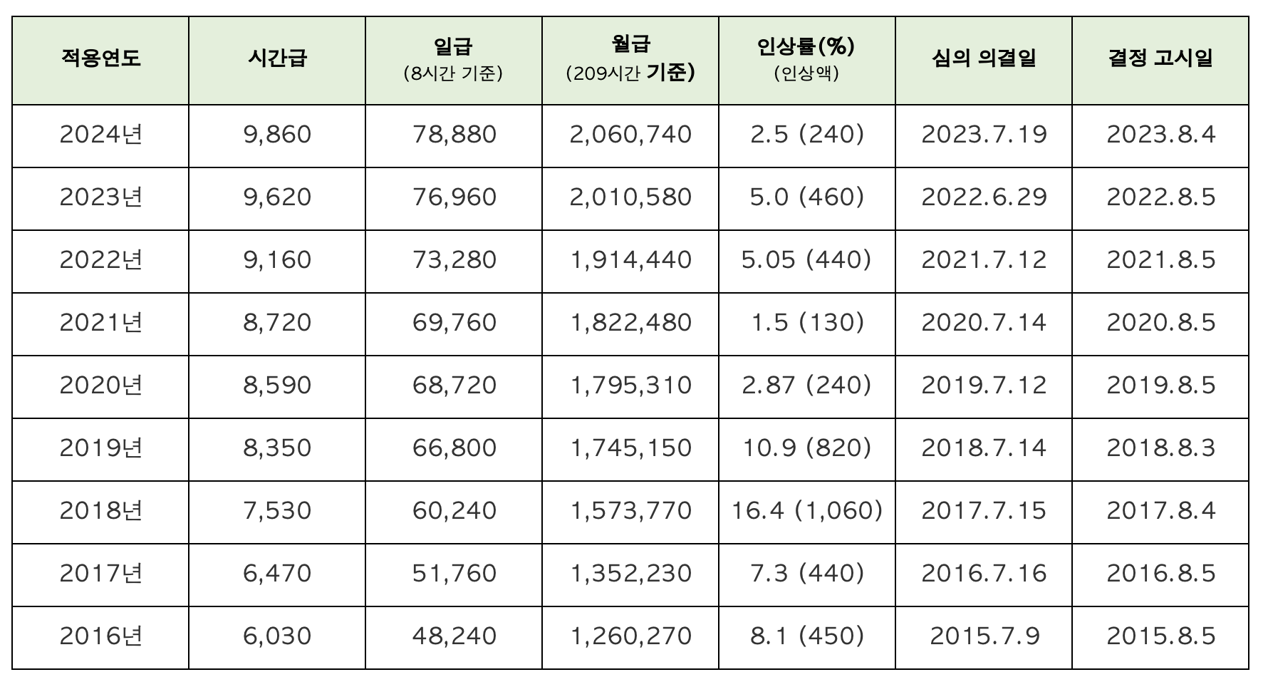 연도별 최저시급은 2016년 6,030원 → 2017년 6,470원 → 2018년 7,530원 → 2019년 8,350원 → 2020년 8,590원 → 2021년 8,720원 → 2022년 9,160원 → 2023년 9,620원 → 2024묨 9,860원