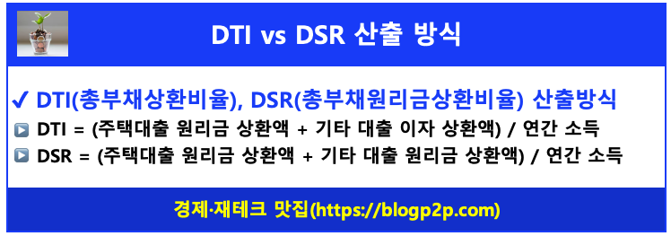 - DSR = (주택대출 원리금 상환액 + 기타 대출 원리금 상환액) / 연간 소득