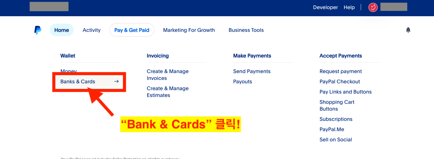 결제하기 및 결제받기 메뉴 하단에 "Bank & cards" 메뉴를 클릭한다
