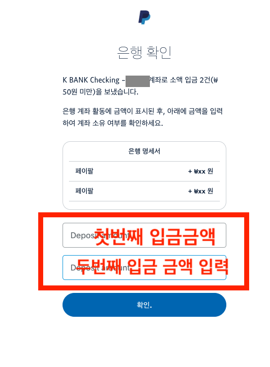 그러면 우측과 같이 2번 입금된 금액을 적어주면 된다 이렇게 마무리되면 페이팔 계좌 회원가입과 은행계좌 연동이 마무리된다.