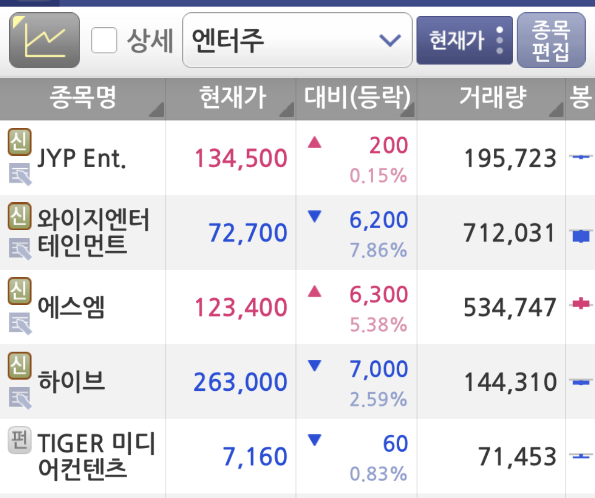 23년 7월 12일(수) 11시 20분 기준 엔터주 테마주의 주가 흐름은 아래와 같습니다.